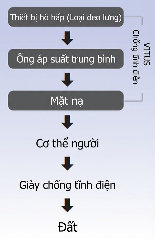 Tĩnh điện phát sinh trên thiết bị trợ thở do ma sát v.v. sẽ được dẫn qua mặt nạ vào cơ thể người, và thoát xuống đất thông qua chân (giày chống tĩnh điện). Vui lòng sử dụng sản phẩm này như một biện pháp an toàn khi làm việc trong môi trường có nguy cơ cháy nổ hoặc tại các nơi làm việc cần có biện pháp đối phó với tĩnh điện.